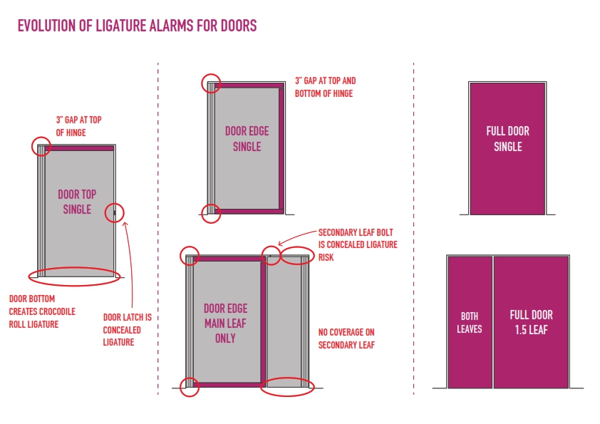 - Addresses ligature risk at all heights – not just the top, like other door-top alarms