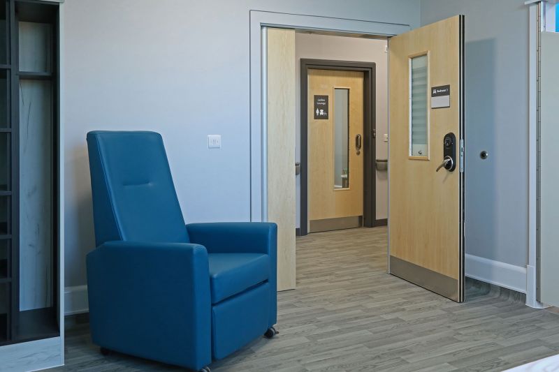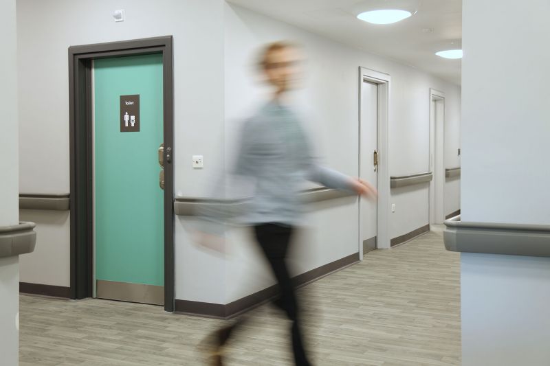 Colour-Coded Doors: Using high-contrast colours on patient room doors and staff-only doors aids wayfinding, which is particularly important for dementia patients who may struggle with spatial orientation.