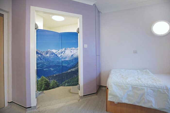 Fitted throughout with the printed mountain and beach scene leaves, the en-suite door also brightens the room and makes it feel less clinical. Made from a soft, lightweight foam and PVC the leaves can’t be used as a weapon. Staff have also noticed “it’s easy to clean and low maintenance”.